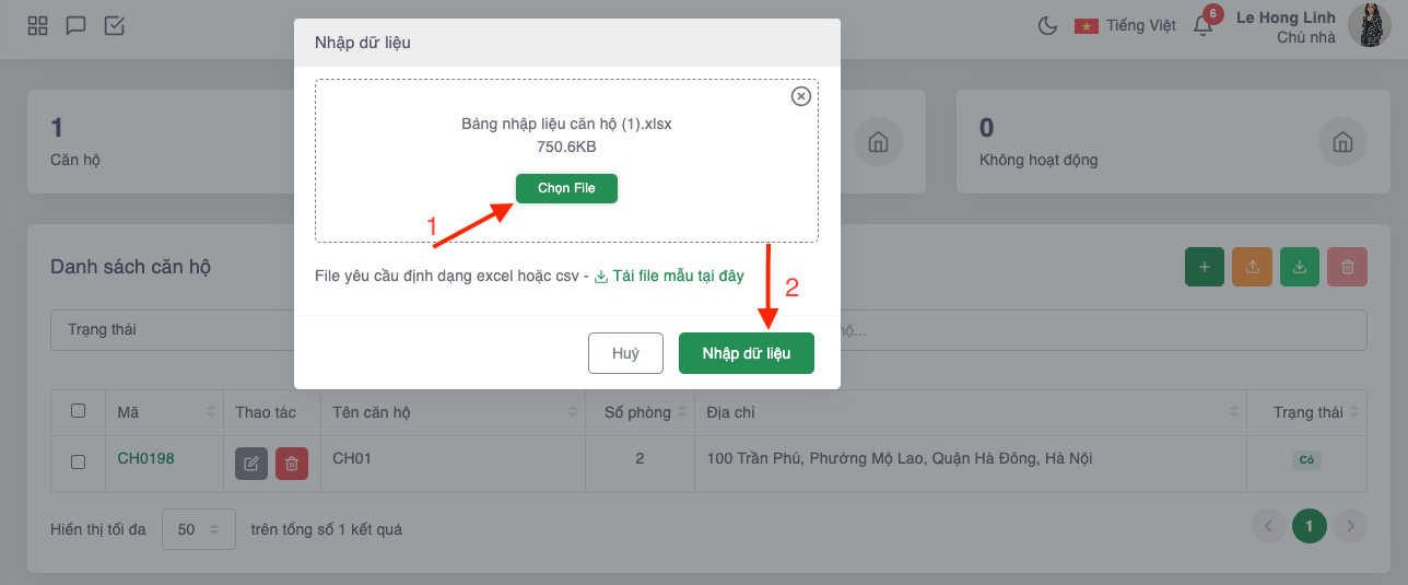 Bước 5: Đẩy file dữ liệu chứa thông tin Khu kiosk, Kiosk cần tạo lên hệ thống bằng cách ấn nút "Chọn file" hoặc "Kéo thả file" vào màn Chi tiết nhập dữ liệu. Sau đó ấn nút Nhập dữ liệu