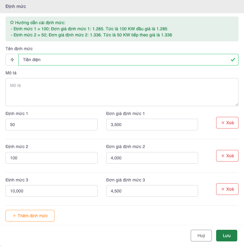 Hiện nay, ngoài những đơn vị áp dụng dịch vụ theo đơn giá cố định thì một số đơn vị kinh doanh khác áp dụng dịch vụ theo đơn giá nhà nước hay áp dụng giá với các định mức khác nhau. Để Ban quản lý có thể linh hoạt cấu hình dịch vụ theo thực tế, Vmarket hỗ trợ tính năng **Thêm định mức** mới. Thao tác cụ thể như sau: