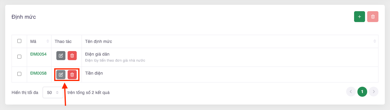 Nếu bạn Thêm định mức thành công, hệ thống sẽ bắn thông báo “Dữ liệu đã được TẠO thành công” và hiển thị thông tin định mức mới tại màn Danh sách định mức. Trong trường hợp bạn cần Sửa, Xóa thông tin Định mức -> Hãy chọn nút Sửa hoặc Xóa.