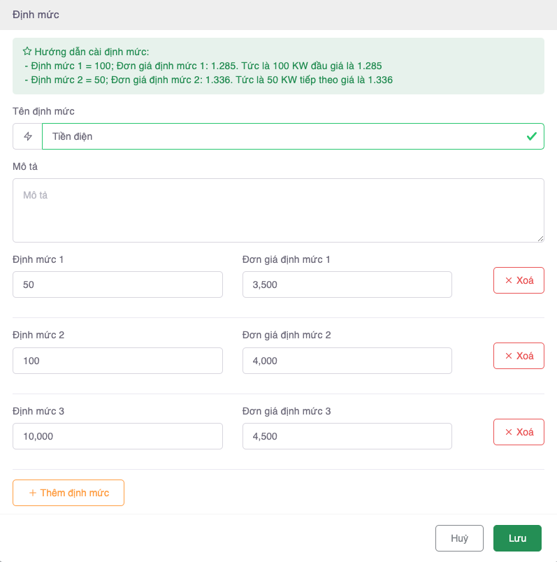 Hiện nay, ngoài những đơn vị áp dụng dịch vụ theo đơn giá cố định thì một số đơn vị kinh doanh khác áp dụng dịch vụ theo đơn giá nhà nước hay áp dụng giá với các định mức khác nhau. Để Ban quản lý có thể linh hoạt cấu hình dịch vụ theo thực tế, Vmarket hỗ trợ tính năng Thêm định mức mới. Thao tác cụ thể như sau:
