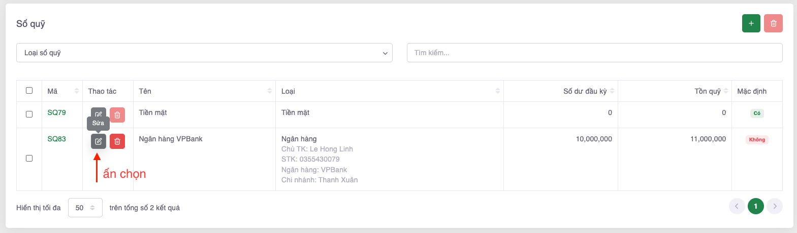 * Tại màn hình danh sách sổ quỹ, ấn nút **Sửa**