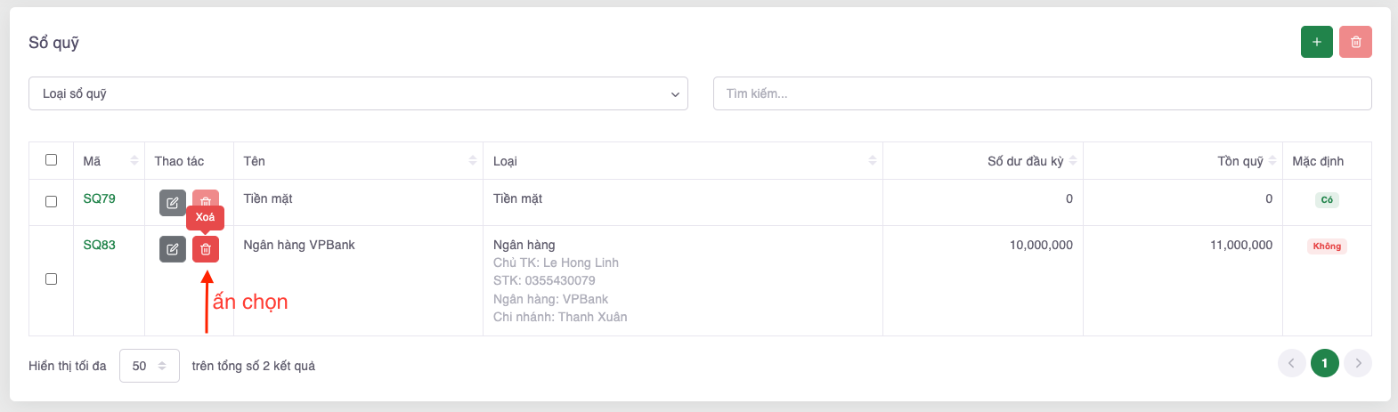 **Bước 1**: Tại màn hình danh sách sổ quỹ, ấn nút **Xoá**