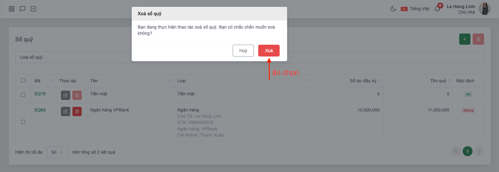 * Còn nếu bạn vẫn muốn xoá sổ quỹ, hãy ấn nút **Xoá** để xác nhận