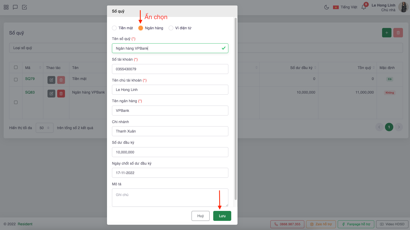 **Bước 3**: Tại màn hình chi tiết Thêm sổ quỹ, hãy chọn loại sổ quỹ và điền thông tin theo yêu cầu từ hệ thống
