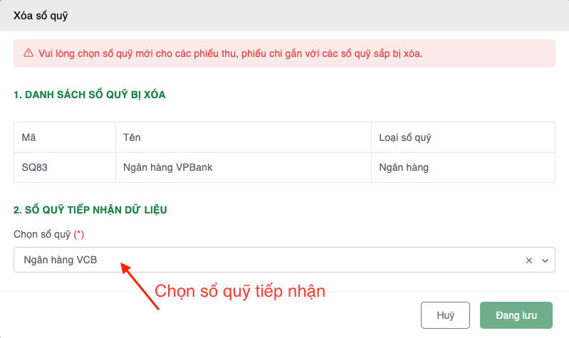 **Bước 3**: Hệ thống sẽ hiển thị lên chi tiết màn hình xoá sổ quỹ. Hãy ấn chọn **Sổ quỹ tiếp nhận dữ liệu** của Sổ quỹ bị xoá trong danh sách được hiển thị sẵn và ấn nút **Lưu để** hoàn thành thao tác