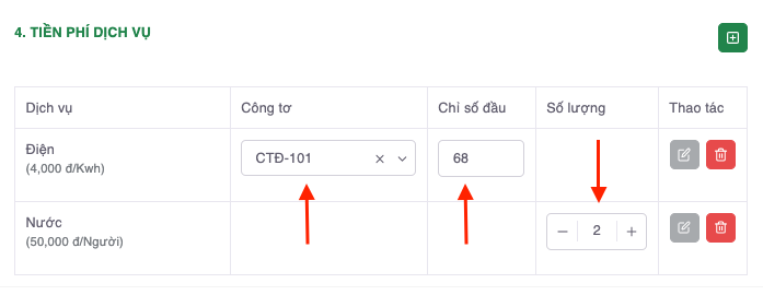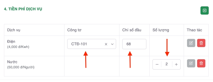Sau đó, ấn nút Chọn để hoàn thành thao tác chọn danh sách dịch vụ mà khách hàng sử dụng. Nếu thành công, hệ thống sẽ hiển thị các dịch vụ đó ra màn hình ngoài phần thông tin Tiền Dịch vụ & Phí. Ngoài ra, hãy điền sẵn thông tin chỉ số đầu của điện nước hoặc số lượng gán với từng dịch vụ