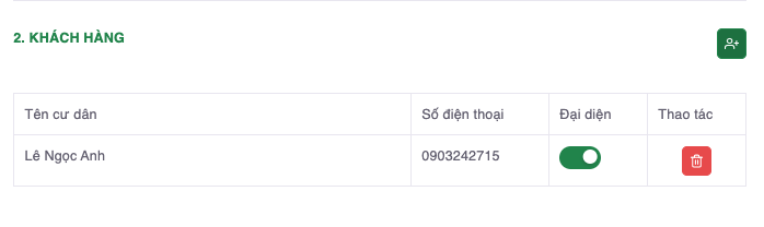 Cuối cùng, ấn nút Chọn để hoàn thành thao tác chọn khách thuê gán với hợp đồng. Nếu thành công, hệ thống sẽ hiển thị khách thuê đó ra màn hình ngoài phần Khách hàng