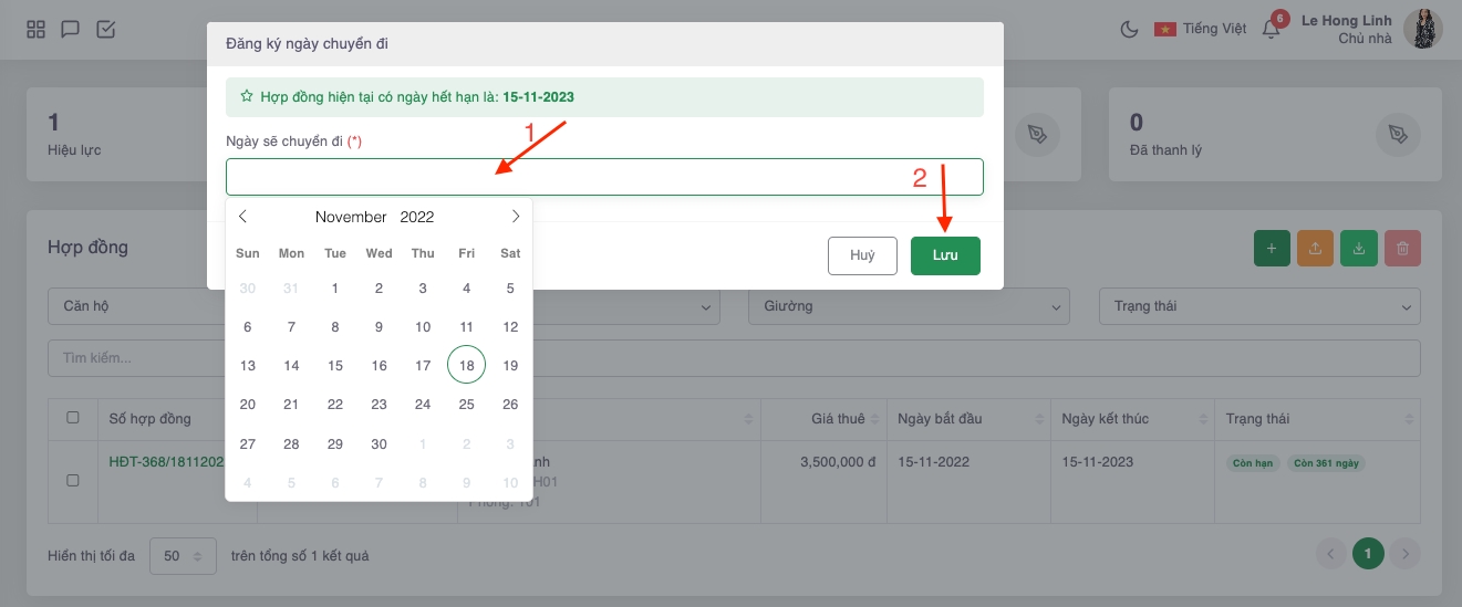 Để lưu thông tin ngày khách chuyển đi trên hệ thống. Tại màn hình danh sách hợp đồng, ấn nút Đăng ký ngày chuyển đi