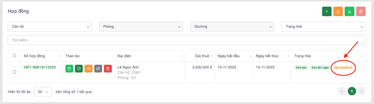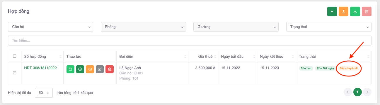Nếu đăng ký ngày chuyển đi thành công hệ thống sẽ hiển thị trạng thái Sắp chuyển đi tại cột trạng thái trên màn danh sách hợp đồng