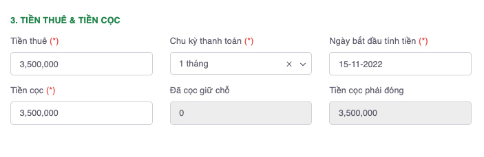 Đã cọc giữ chỗ: Hệ thống sẽ hiển thị sẵn số tiền khách thuê đã đặt cọc giữ chỗ trước đó (nếu có)