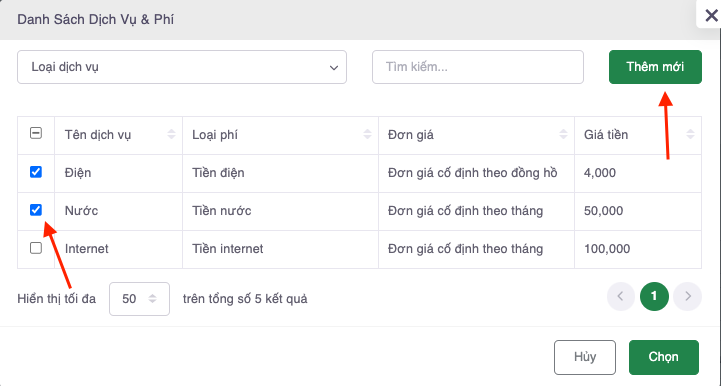 Lúc này, màn hình Danh sách Dịch vụ & Phí sẽ xuất hiện. Hãy tích chọn dịch vụ trong danh sách có sẵn hoặc ấn nút Thêm mới để thêm dịch vụ mới vào danh sách chọn