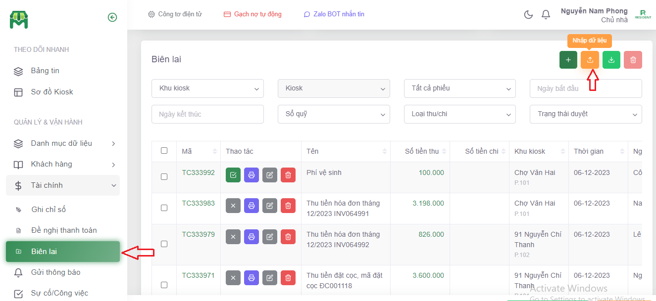 * Điền và thêm thông tin liên quan đến Biên lai thu như: **Khu kiosk, Kiosk, Khách hàng, Tên biên lai thu, Ngày thu,...**