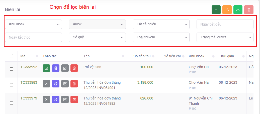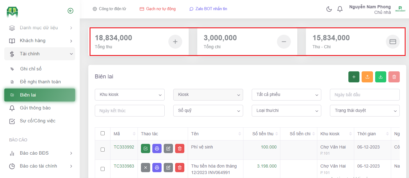 Tại màn hình Biên lai bạn có thể xem tổng số tiền đã thu hoặc đã chi tại Căn hộ theo các trường thông tin lọc như: Khu kiosk, Kiosk, Sổ quỹ, Loại Biên lai, Thời gian,….tại phần thống kê phía trên danh sách Biên lai.