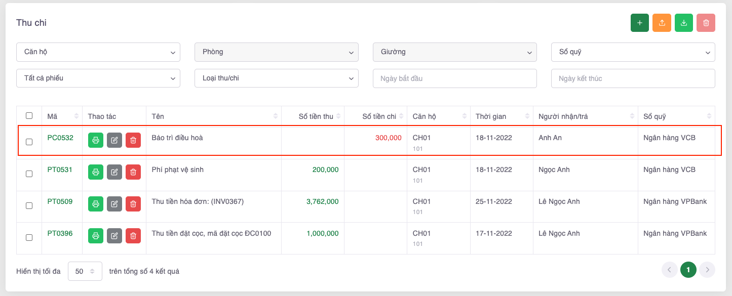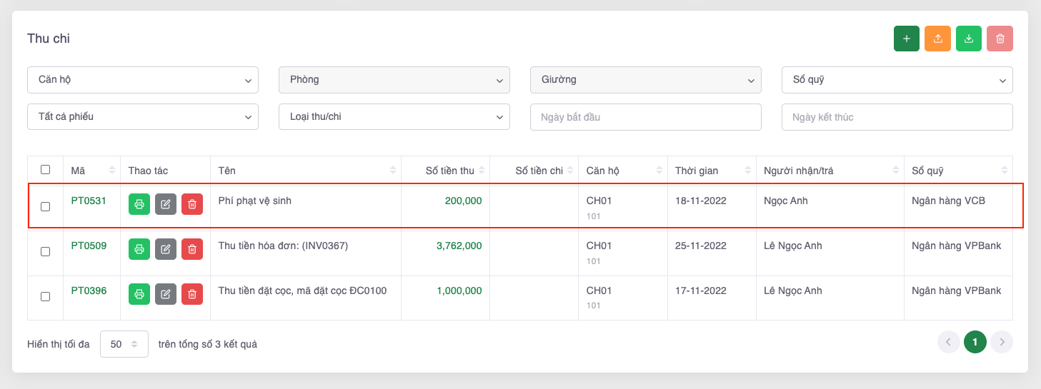 * Nếu thành công hệ thống hiển thị thông tin Biên lai chi ra màn hình Danh sách Biên lai như hình bên dưới