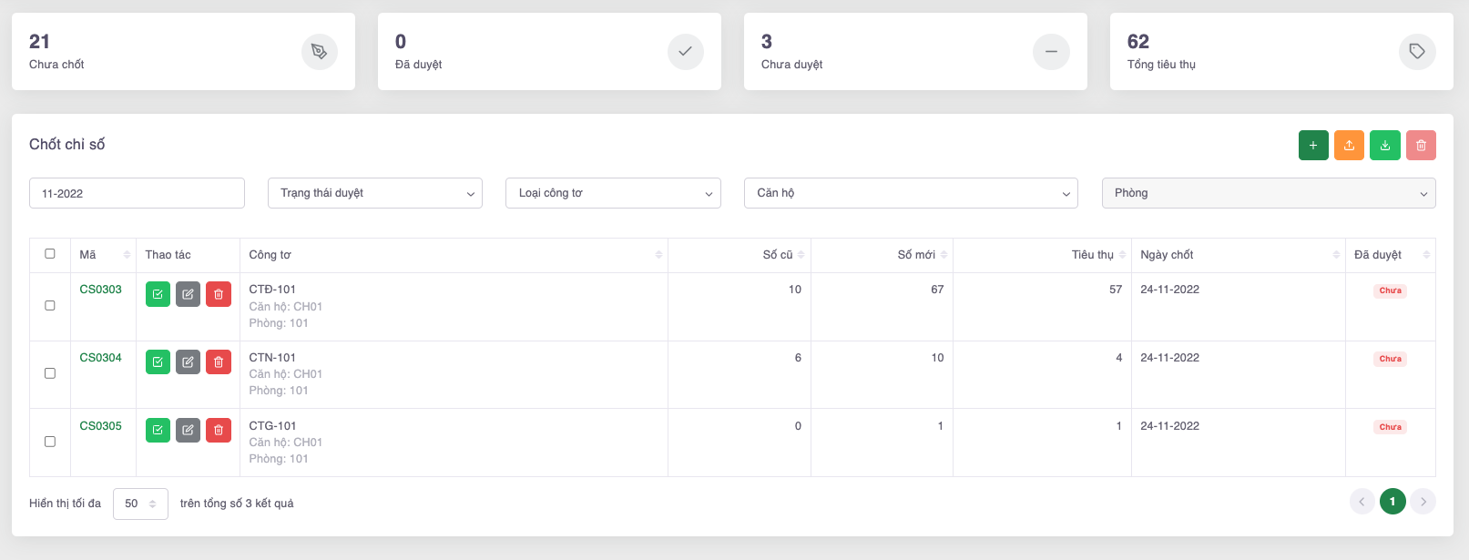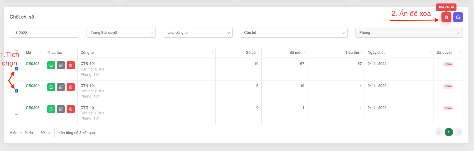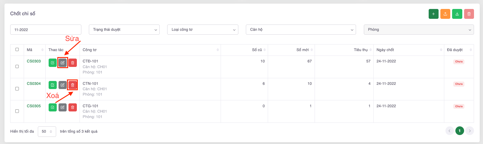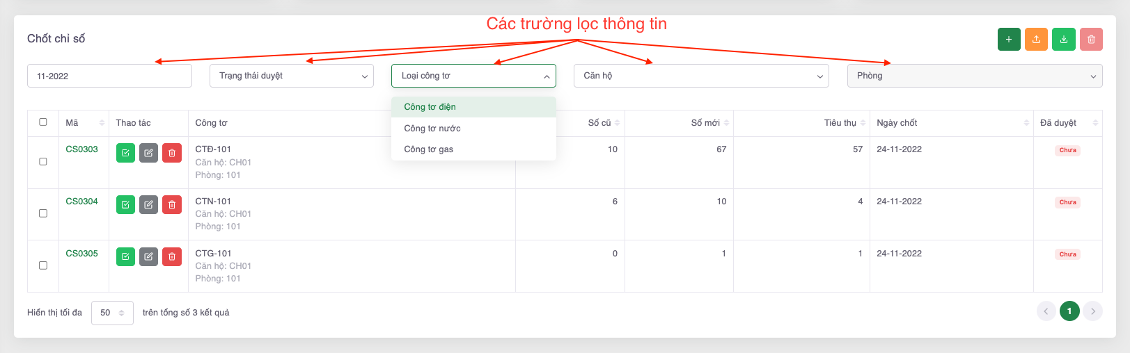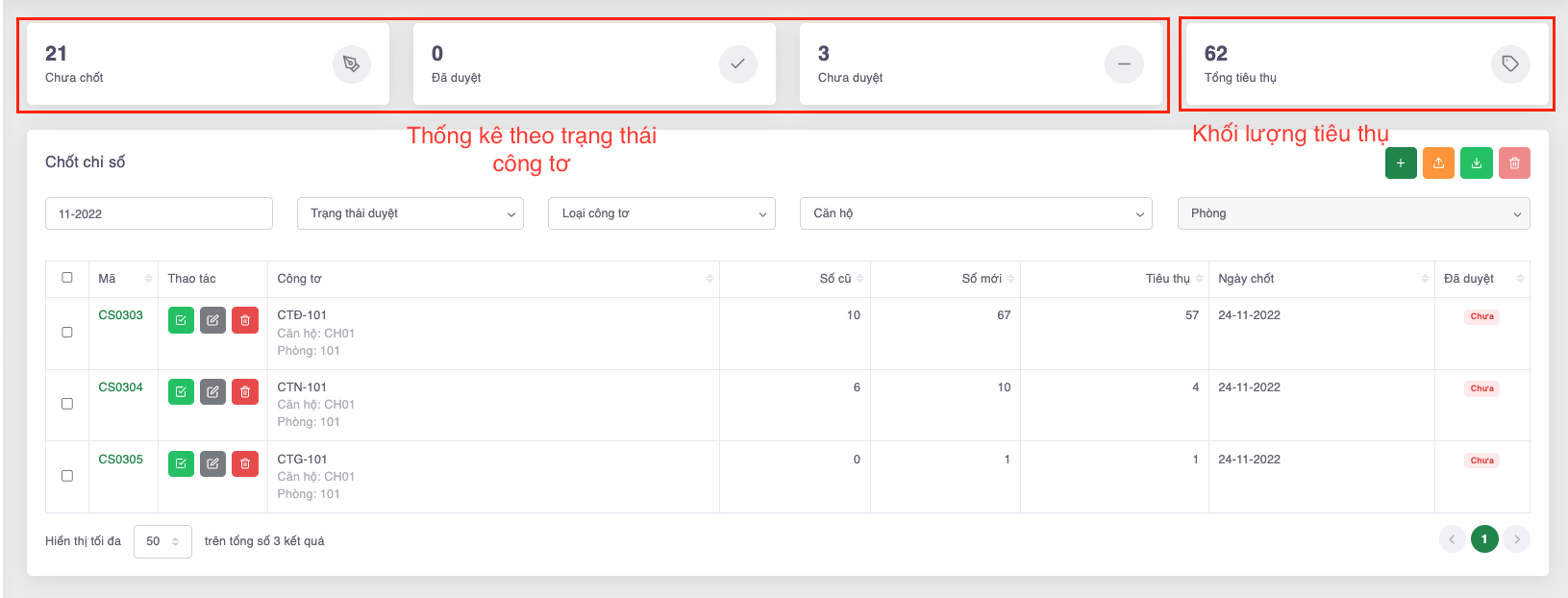 * Chưa duyệt: Số lượng chỉ số công tơ chưa được duyệt trong tháng