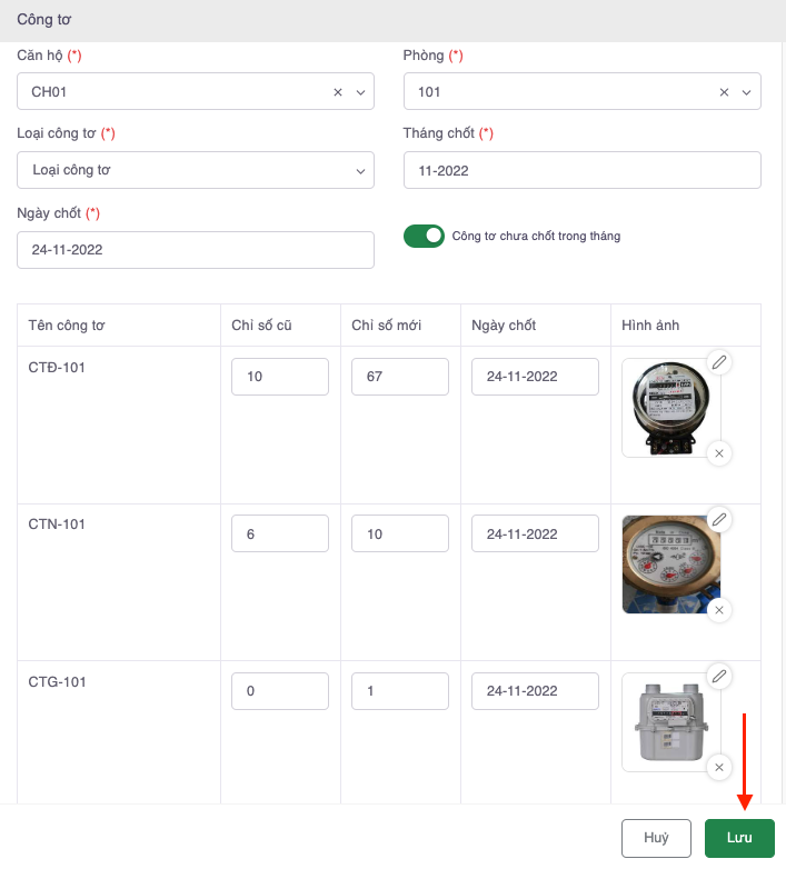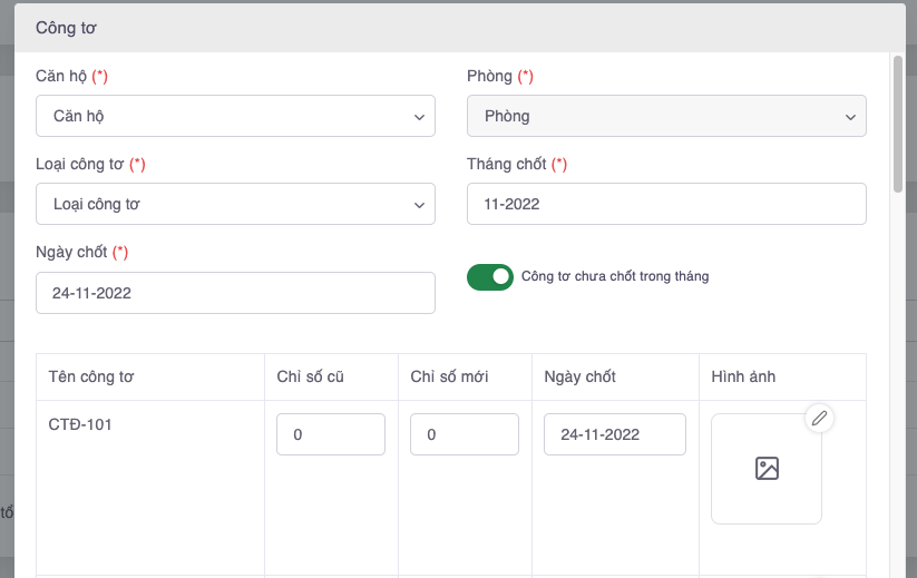 * Điền **Chỉ số đầu**, **Chỉ số mới**, **Ngày chốt**, **Hình ảnh công tơ**