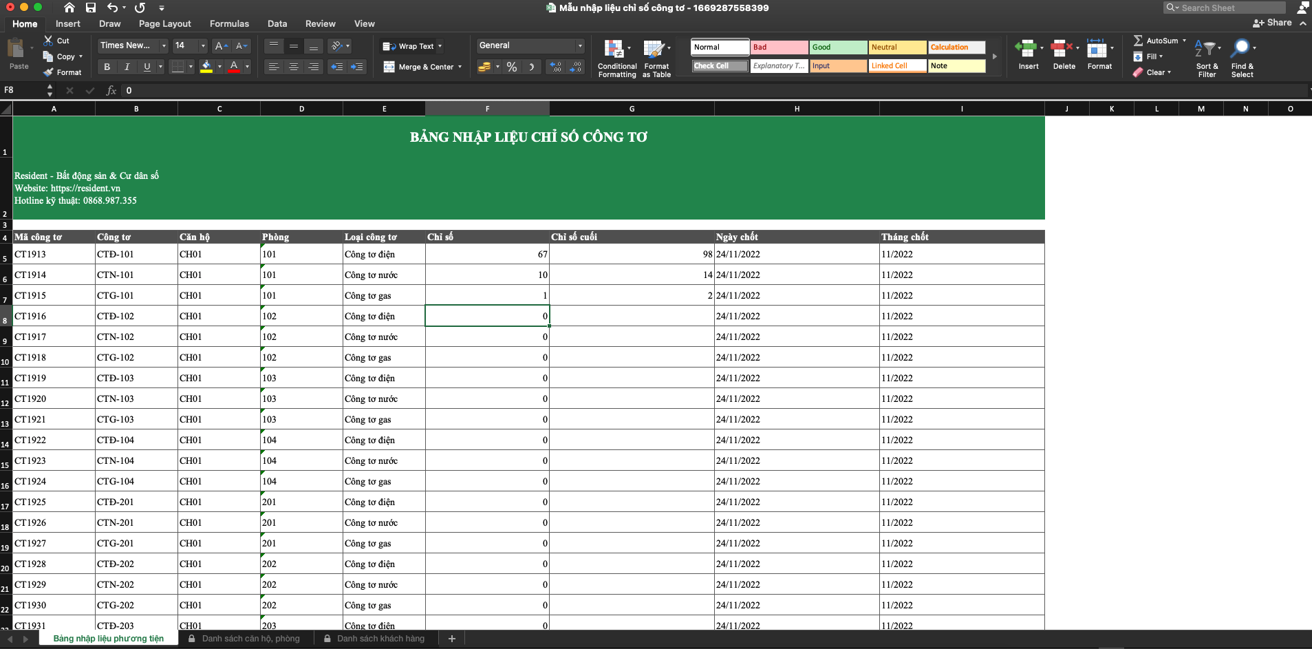 **Bước 4**: Mở file mẫu và điền dữ liệu công tơ theo các trường thông tin hệ thống yêu cầu nhập. *Lưu ý:*