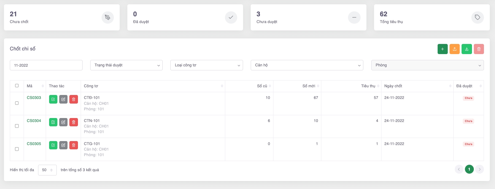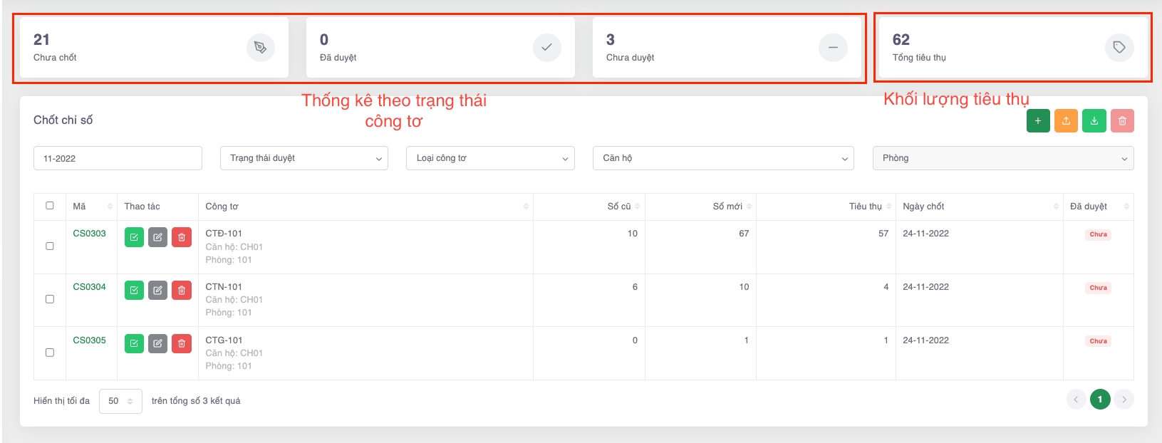 Tại màn Chốt chỉ số hệ thống đã hiển thị các con số thống kê theo trạng thái công tơ như: