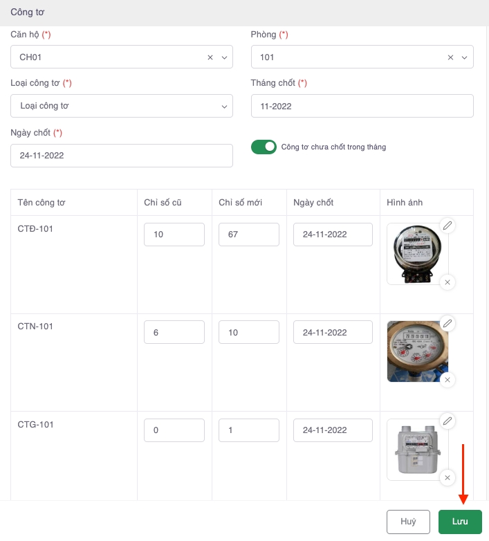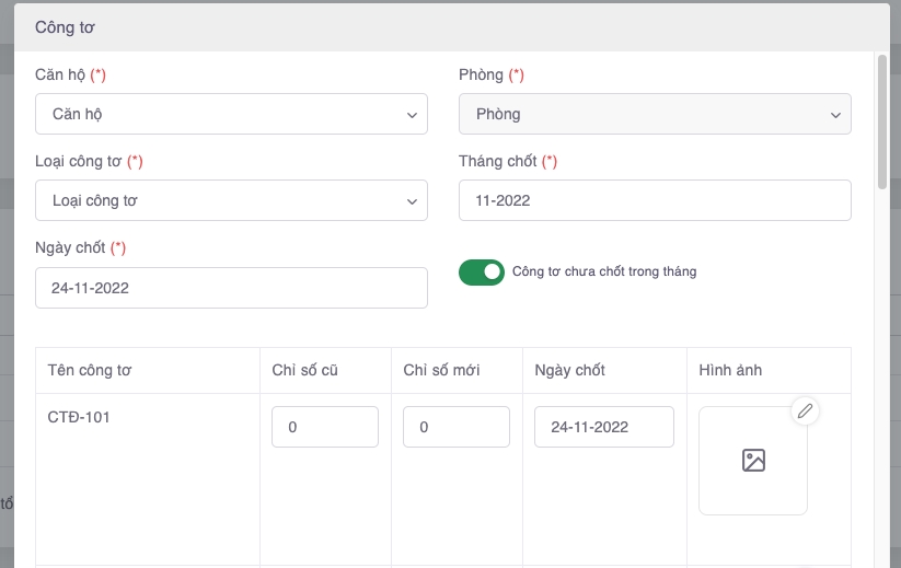 Điền Chỉ số đầu, Chỉ số mới, Ngày chốt, Hình ảnh công tơ
