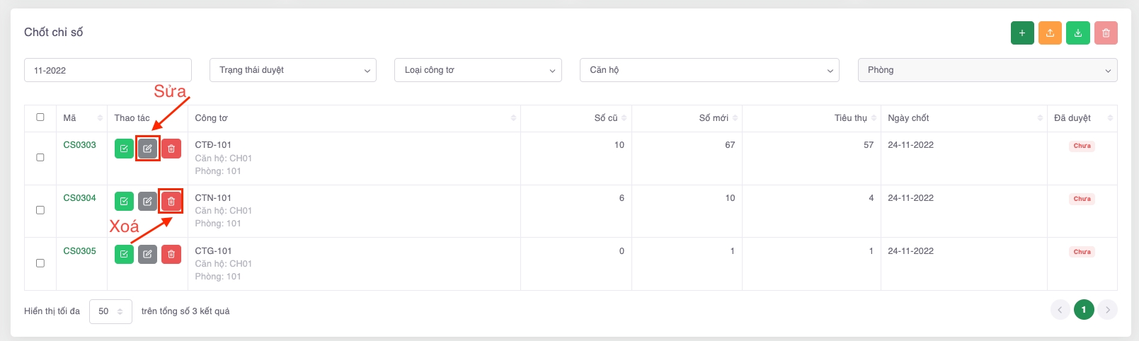 Nếu bạn muốn Sửa, Xoá chỉ số đã chốt, hãy ấn nút Sửa hoặc Xoá